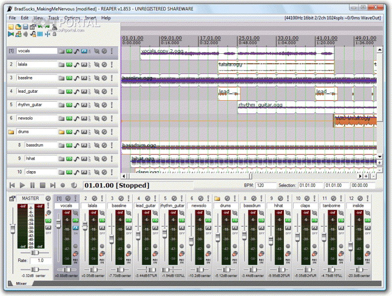 Reaper - очень мощный аудио редактор. Позволяет записывать, подготавливать, редактировать и создавать многоканальные аудио треки. Содержит множество полезных функций и эффектов. Поддерживает технологии ASIO, Kernel Streaming, WaveOut и DirectSound воспроизведение и запись. Может работать с файлами в форматах WAV, OGG, MP3, MIDI (чтение) и WAV, MIDI (запись). Имеется возможность индивидуальной обработки каждого трека по отдельности. Поддерживает управление уровнем громкости, границами трека, контролем согласования, проводит многоуровневый откат/повтор действий и многое другое.